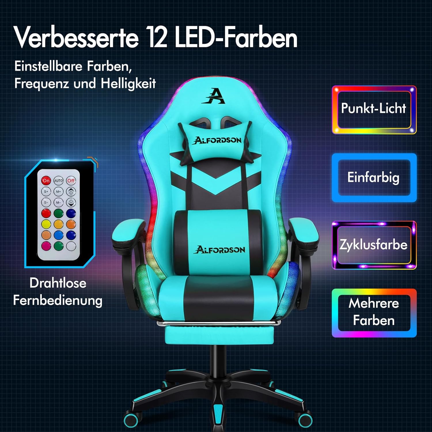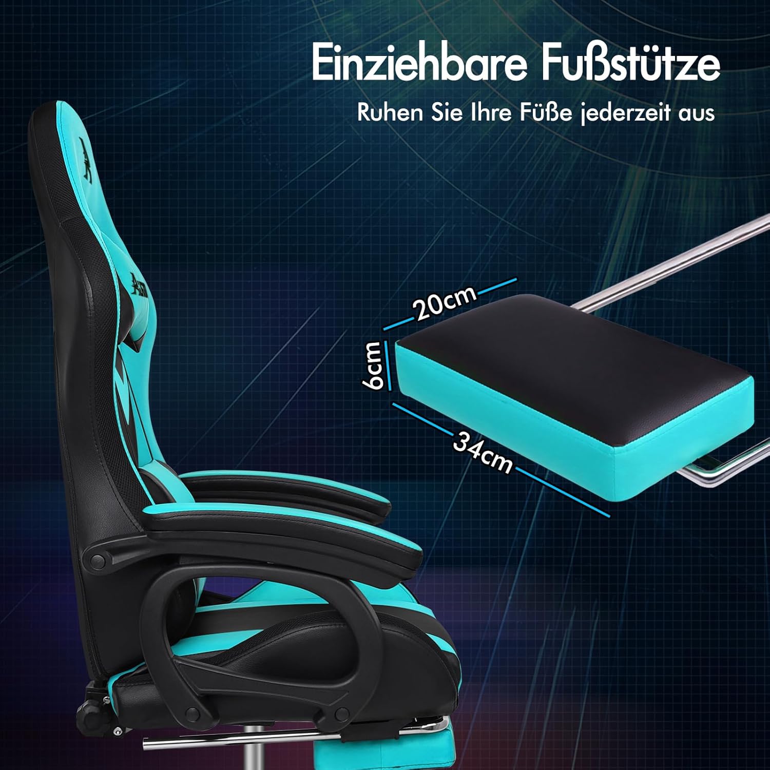 Der ALFORDSON Gaming Chair aus der Marc-Serie in strahlendem Cyan ist weit mehr als nur ein Bürostuhl – er ist ein Statement für Leidenschaft, Komfort und modernes Design. Ob Sie stundenlange Gaming-Sessions absolvieren, produktiv an anspruchsvollen Projekten arbeiten oder einfach nur nach einem langen Tag entspannen möchten: Dieser multifunktionale High-End-Stuhl bietet Ihnen ein unvergleichliches Sitzgefühl, das Körper und Geist gleichermaßen verwöhnt. Mit seiner ergonomischen Bauweise, dem integrierten 8-Punkt-Massage-System, dem einstellbaren Fußstützen-Set und einem atemberaubenden RGB-LED-Lichtsystem mit 12 Farben und über 360 Beleuchtungsmodi schafft dieser Stuhl eine Atmosphäre, die sowohl die Sinne als auch die Leistungsfähigkeit beflügelt.