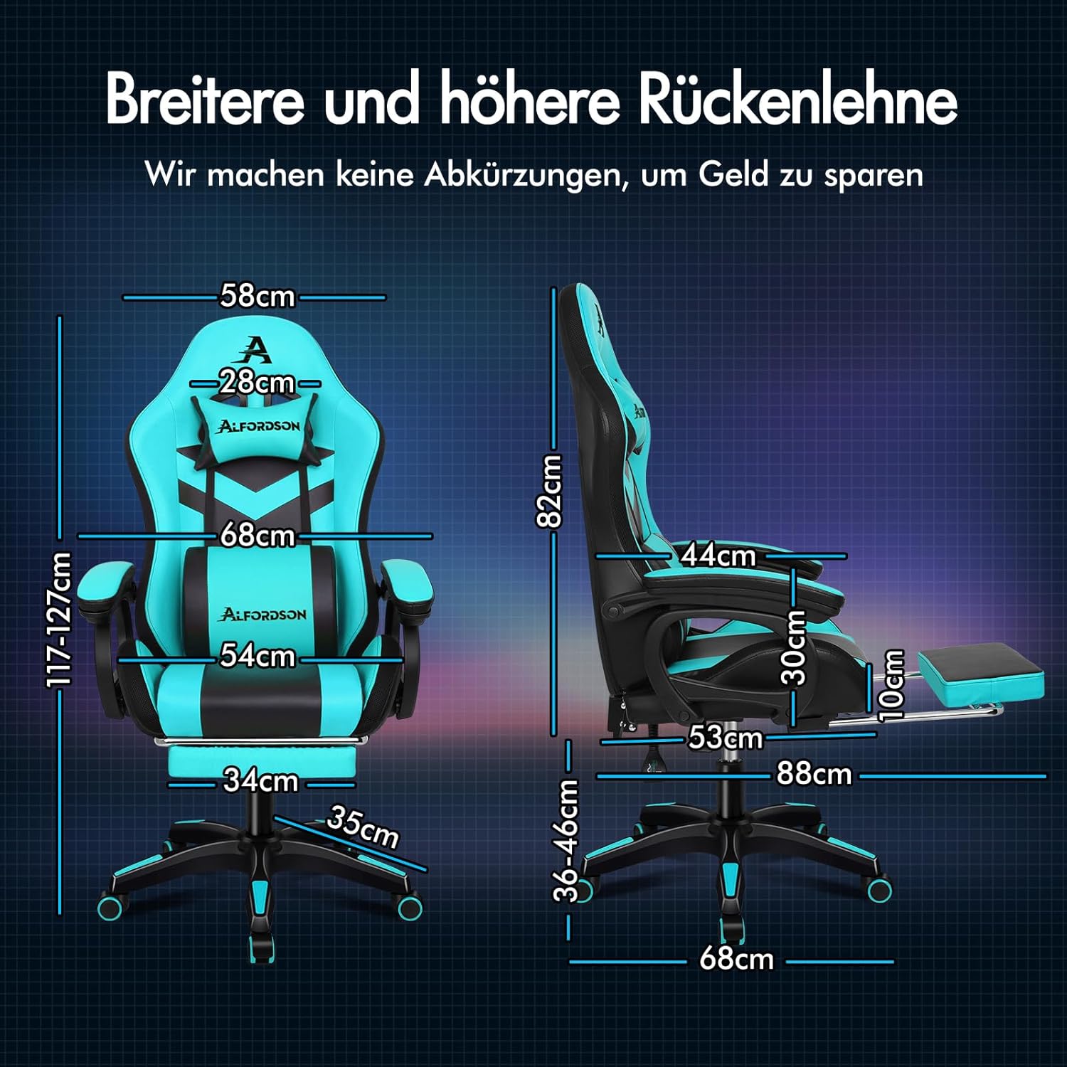 Der ALFORDSON Marc Gaming Chair in Cyan ist mehr als nur ein Möbelstück – er ist ein Lifestyle-Element, das Ihren Alltag bereichert, Ihre Gesundheit fördert und Ihre Leidenschaften unterstreicht. Ob als Arbeitsplatz, Gaming-Thron oder Entspannungsoase – dieser Stuhl überzeugt in jeder Situation mit Premium-Qualität, smarter Technologie und einem Design, das begeistert. Gönnen Sie sich und Ihrer Familie das Beste aus Komfort, Sicherheit und Ästhetik – der ALFORDSON Marc Chair ist eine Investition in Wohlbefinden, Leistung und Lebensfreude.