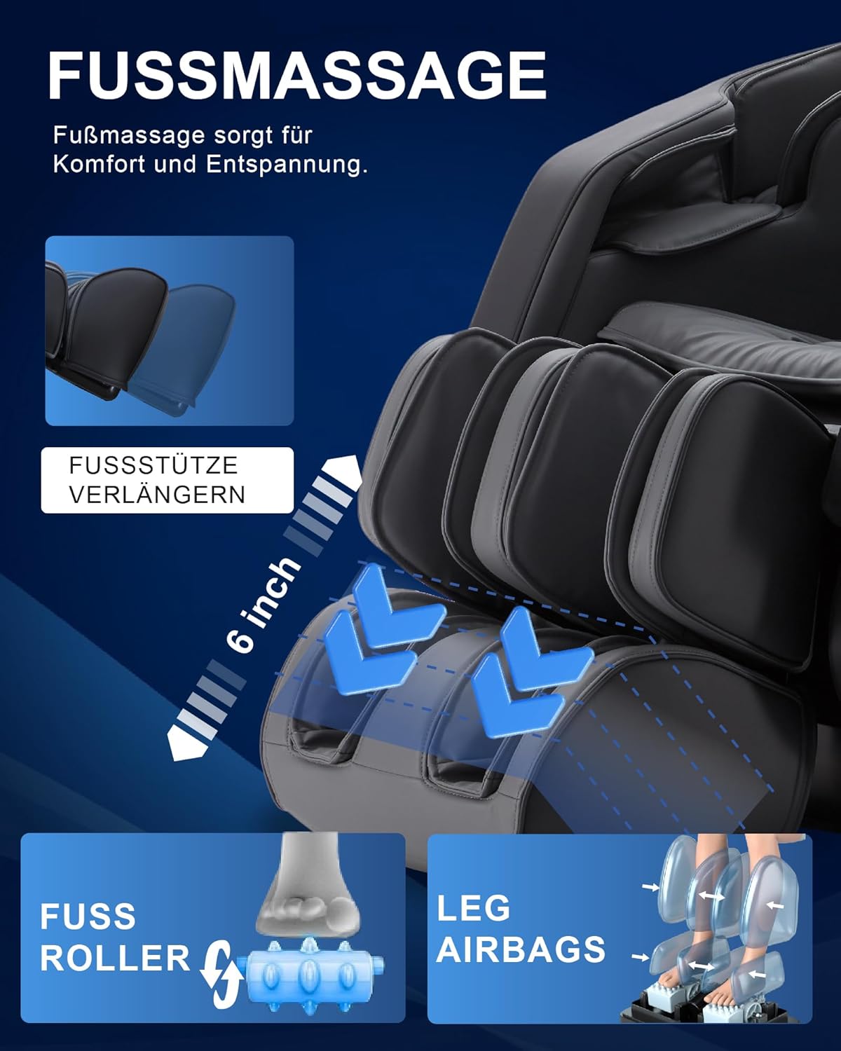 Durch die gleichmäßige Verteilung der Airbags entsteht ein harmonisches Massagegefühl, das den gesamten Körper umschließt – wie eine wärmende Umarmung nach einem langen Tag. Die Luftdruckmassage kann unabhängig von der Rollermassage genutzt werden und eignet sich hervorragend für Personen, die eine sanftere, aber dennoch wirksame Entspannung bevorzugen.