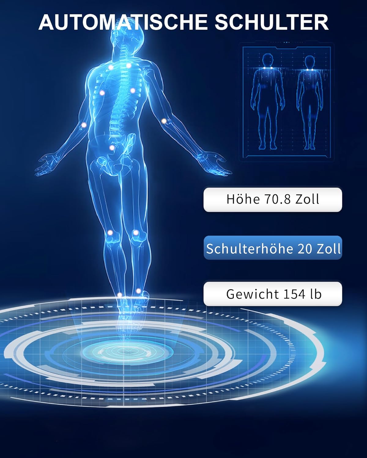 - Automatisches Body-Scanning für perfekte Anpassung an Körpergröße (1,57–1,86 m) und -form