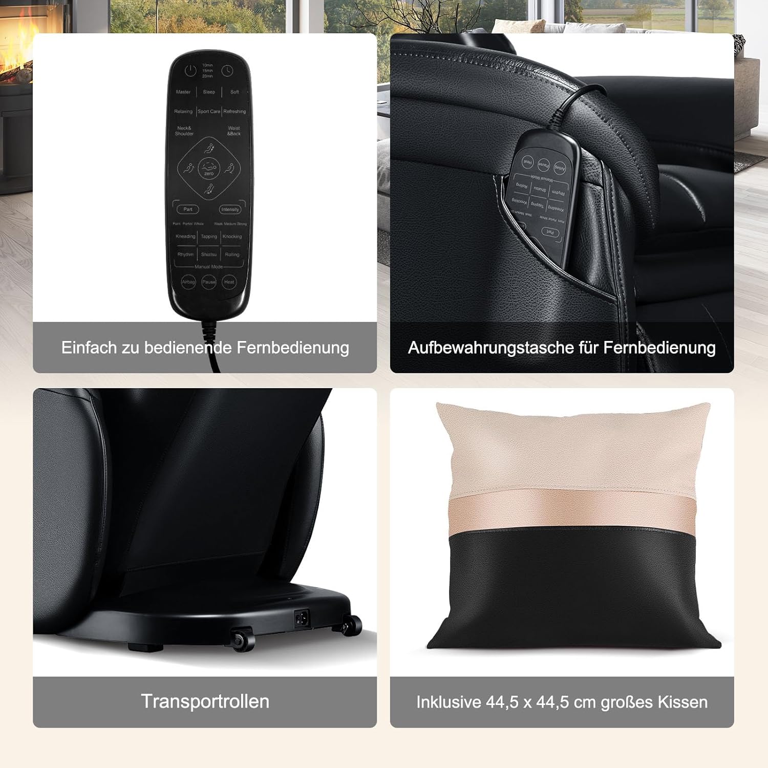 - Lieferumfang: 1 x Massage Chair, 1 x Fernbedienung, 1 x Kissen (45 x 45 cm), 1 x Bedienungsanleitung