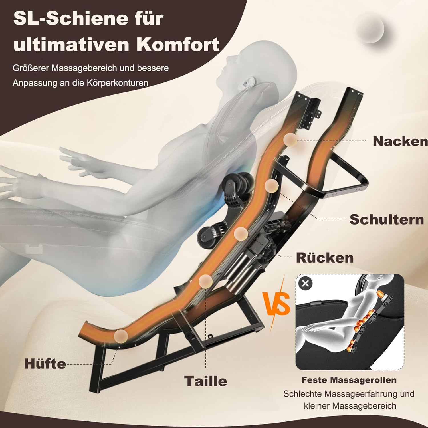 Die Herzstück-Technologie des COSTWAY VX32248DE ist seine SL-Track-Massagebahn, die exakt entlang der natürlichen Wirbelsäulenlinie verläuft. Im Gegensatz zu herkömmlichen linearen Tracks erfasst diese spezielle Bahn den gesamten Bereich von Nacken bis zu den Gesäßmuskeln und ermöglicht so eine nahezu medizinische Präzision bei der Massage. Die SL-Form („S-Shape Long Track“) folgt dem anatomischen Verlauf der Wirbelsäule und sorgt dafür, dass jede Wirbelsäulensegmente gezielt und schonend massiert werden.