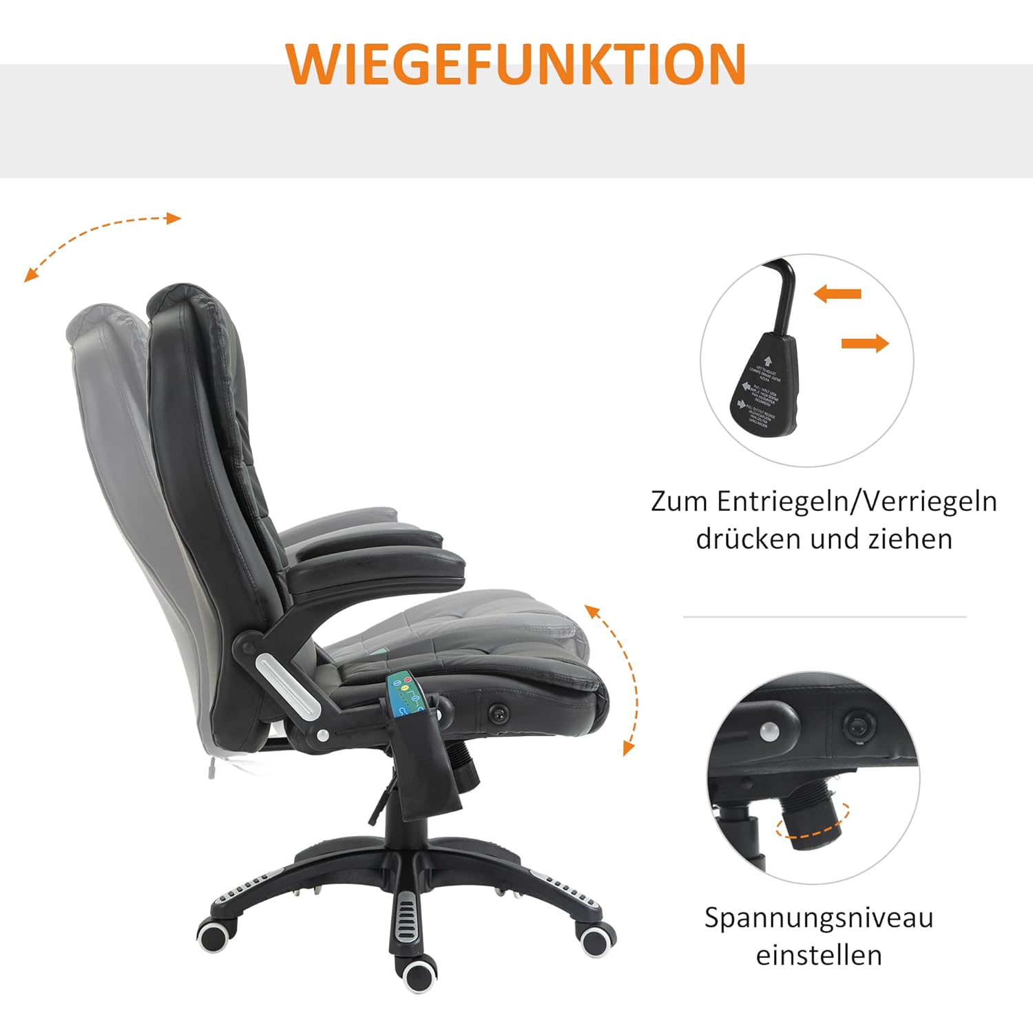 • 6-Punkt-Vibrationsmassage: 4 Massagepunkte im Rückenbereich, 2 im Sitzbereich