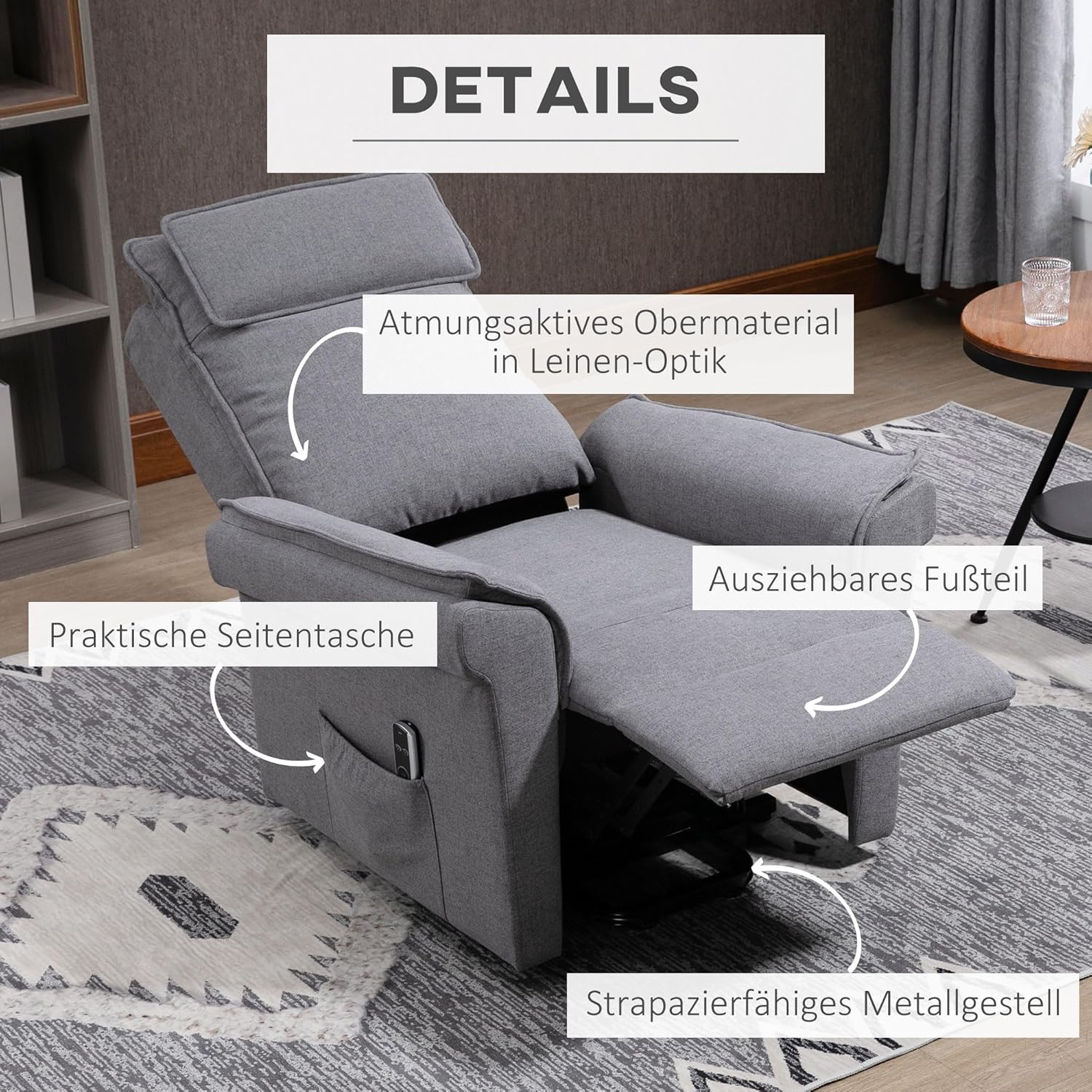 Ein gemütlicher Sessel, der nicht nur zum Entspannen einlädt, sondern Sie sanft und sicher beim Aufstehen unterstützt. Ein Massagefunktion, die gezielt Verspannungen löst und für neues Wohlbefinden sorgt. Ein Design, das modernen Wohnkomfort mit zeitloser Eleganz verbindet. Der HOMCOM Armchair mit integrierter Aufstehhilfe, Massagefunktion und elektrischer Verstellbarkeit ist mehr als ein Möbelstück – er ist ein Begleiter für ein selbstbestimmtes, komfortables Leben zu Hause. Besonders wertvoll für Senioren, Menschen mit eingeschränkter Mobilität oder einfach für alle, die den Luxus von Wellness und Sicherheit im eigenen Wohnzimmer schätzen.