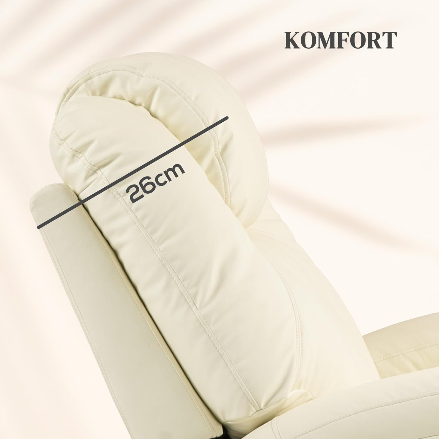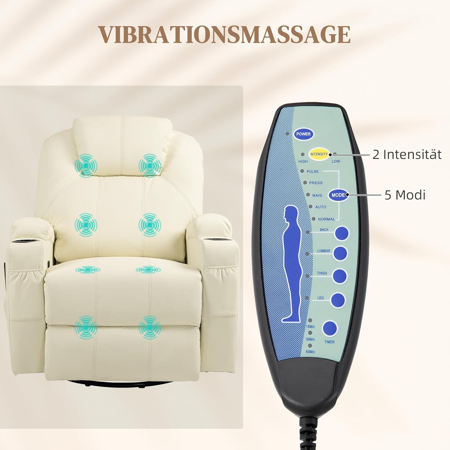 Dieser Premium-Relaxsessel wurde entwickelt, um den Ansprüchen moderner Haushalte gerecht zu werden. Er verbindet die Vorteile einer hochwertigen Massagefunktion mit der Flexibilität eines 360°-Drehstuhls und der Annehmlichkeit einer stufenlos verstellbaren Rückenlehne. Die integrierte Fußstütze, die weiche Polsterung aus pflegeleichtem Kunstleder und die moderne Optik in Cremeweiß machen diesen Sessel zum absoluten Blickfang in jedem Zuhause. Er ist nicht nur ein Ort zum Sitzen, sondern ein Ort zum Wohlfühlen, Auftanken und Genießen.