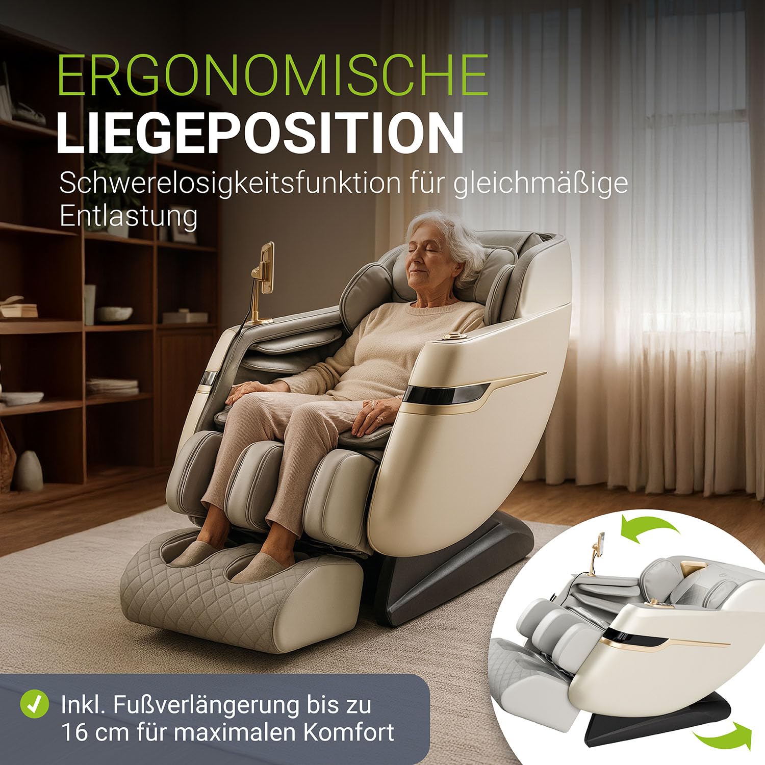 Diese schwebende Lage vermittelt ein einzigartiges Gefühl von Leichtigkeit und Schwerelosigkeit – als würde der Körper sanft in der Luft ruhen. In Kombination mit den Massagefunktionen wird die Wirkung der Zero-Gravity-Position noch verstärkt: Die Muskulatur kann sich tiefer entspannen, die Atmung verlangsamt sich und das vegetative Nervensystem wechselt in den Entspannungsmodus. Ob für eine 15-minütige Mittagspause oder eine ausgedehnte Abendentspannung – die Zero-Gravity-Funktion macht jeden Sitzvorgang zu einem kleinen Kurzurlaub für den Körper.
