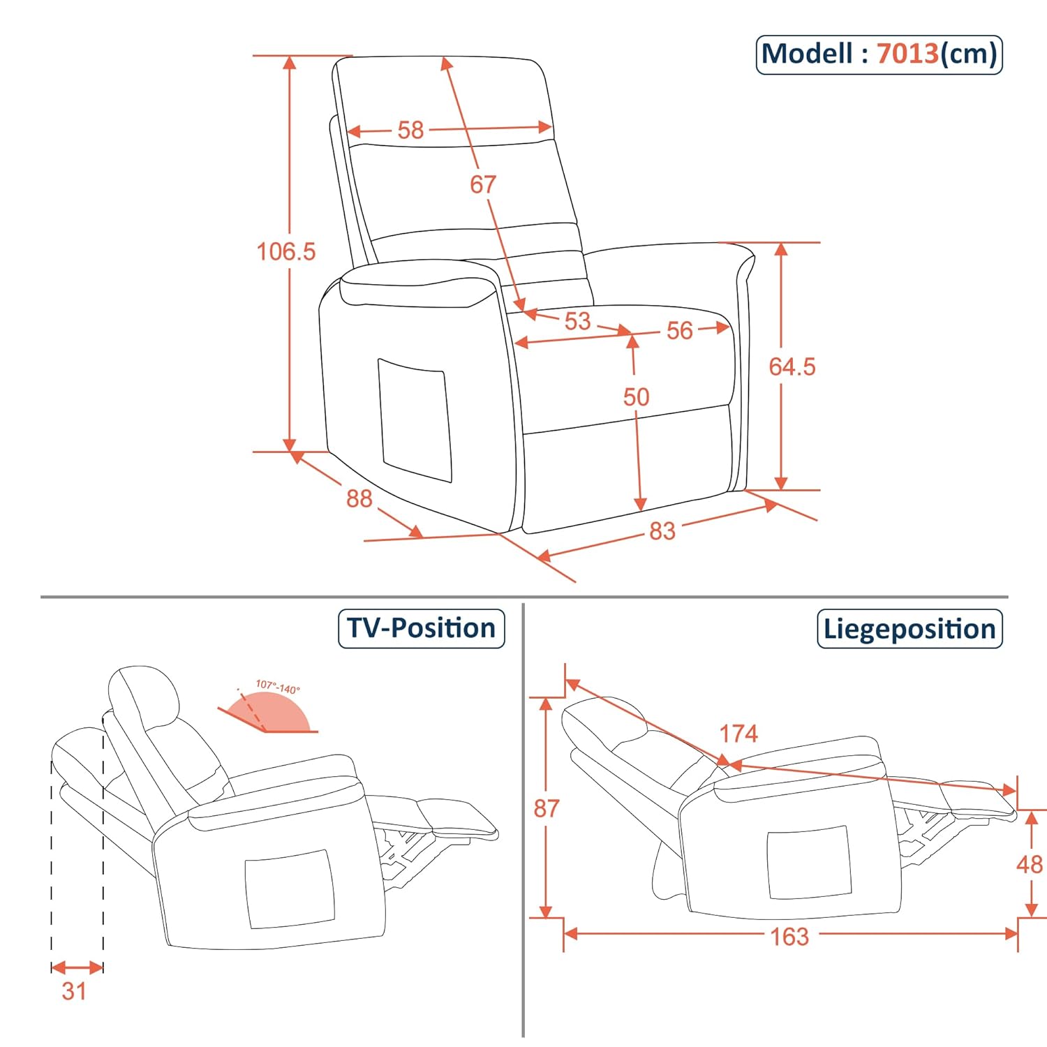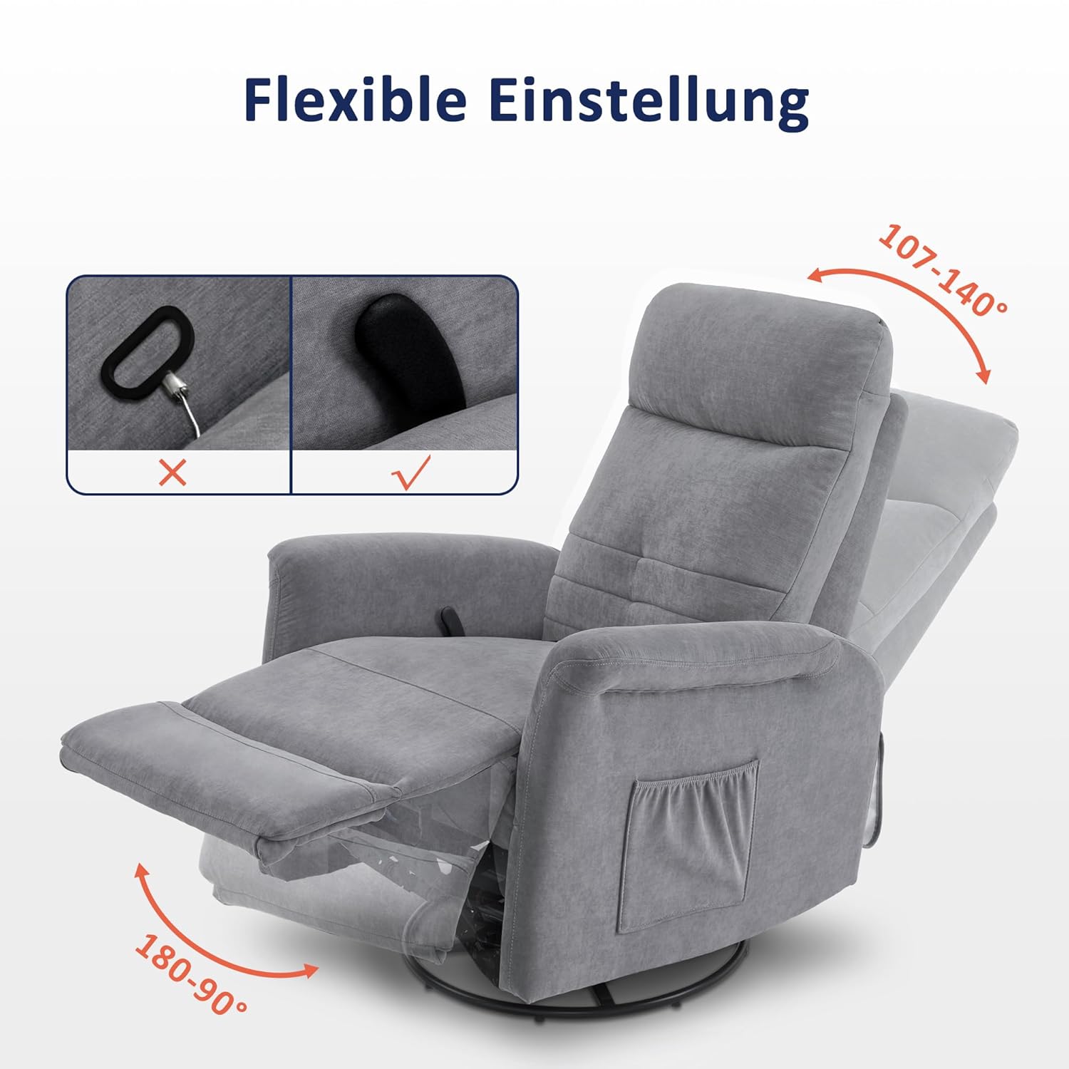 Die verstellbare Rückenlehne lässt sich ganz nach Ihrem Bedarf zwischen 107° und 140° neigen. Diese stufenlose Verstellung erfolgt manuell durch Ihr Körpergewicht – sanft, ruhig und ohne abrupte Bewegungen. Ob Sie aufrecht sitzen möchten, um ein Buch zu lesen, oder sich leicht zurücklehnen, um fernzusehen – der Sessel passt sich jeder Position perfekt an. Die manuell ausziehbare Fußstütze wird per Eisenhebel bedient und bietet zusätzliche Entlastung für Beine und Füße. Besonders nach einem langen Tag schenkt diese Funktion ein Gefühl der Erleichterung und Entspannung.