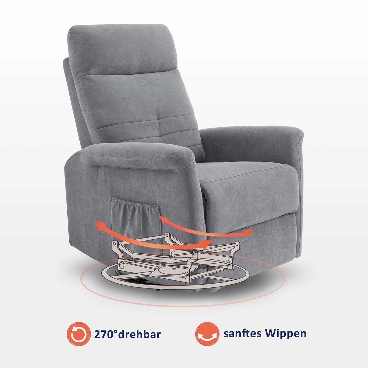 Die 270° Drehfunktion des Sessels bietet maximale Flexibilität im Raum. Ob Sie den Fernseher von einer anderen Position aus sehen möchten, mit der Familie auf der Couch sprechen oder einfach nur die Aussicht aus dem Fenster genießen – der Sessel lässt sich mühelos in jede Richtung drehen. Das Drehgelenk ist robust konstruiert und läuft absolut ruhig und geschmeidig. Es gibt kein Quietschen, kein Klemmen – nur sanfte, kontrollierte Bewegung.