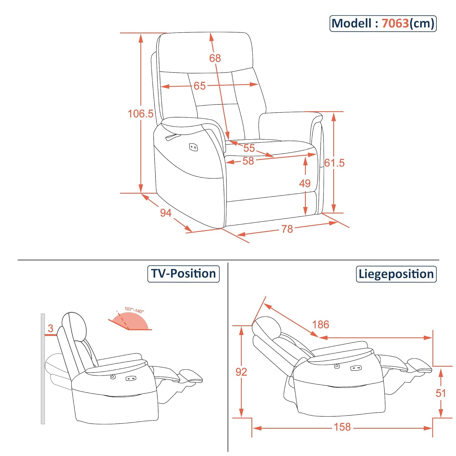- Besondere Merkmale: Höhenverstellbar, elektrisch verstellbare Rückenlehne und Fußstütze, Massagefunktion, USB- und Type-C-Anschlüsse, Lendenkissen