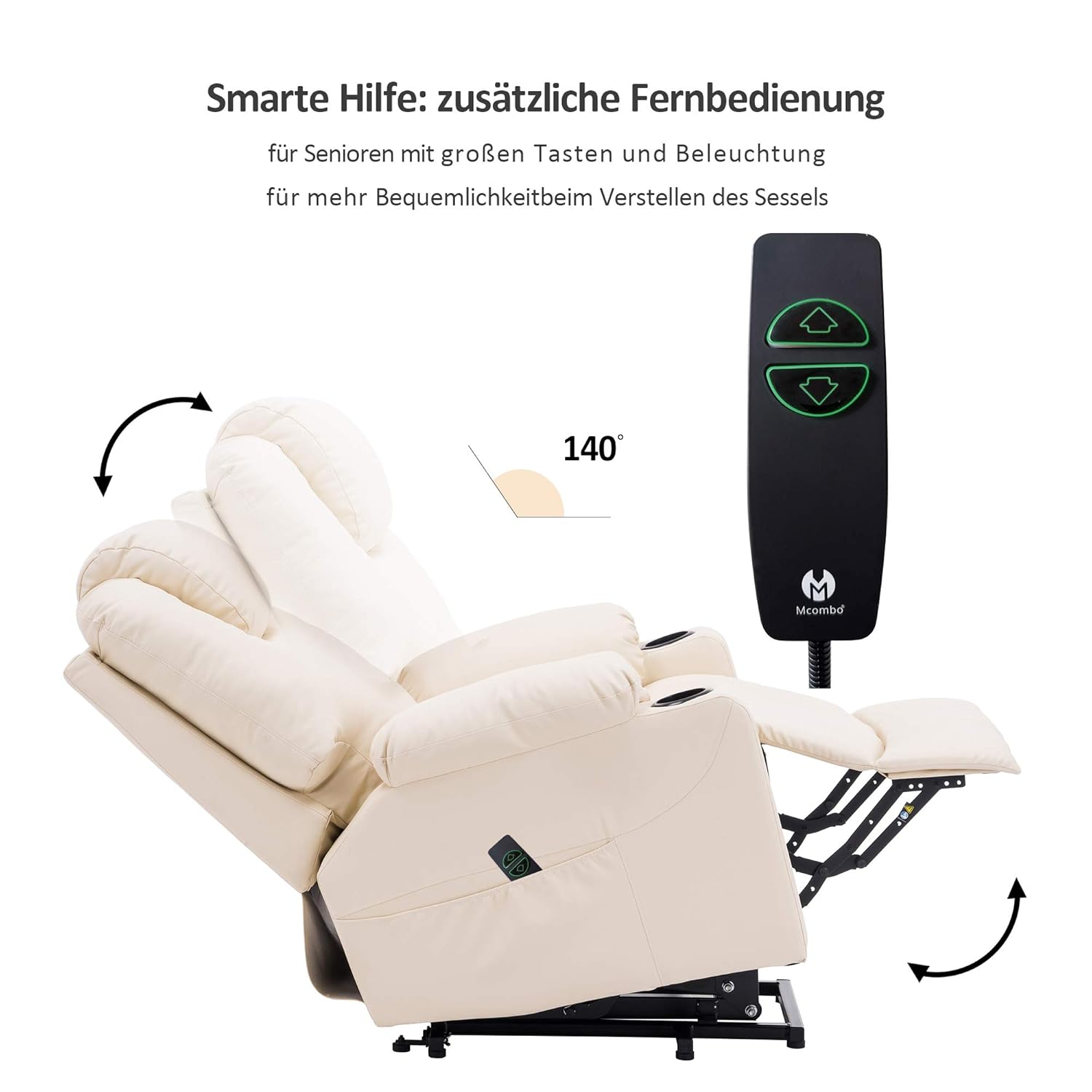 Dank der intuitiven Fernbedienung können Sie die Liegefunktion und die Massagezonen bequem per Knopfdruck aktivieren. Die Kombination aus sanfter Vibration, wohliger Wärme und optimalem Sitzkomfort sorgt für eine spürbare Entlastung von Rücken, Hüfte, Beinen und Waden. Das formschöne Design passt sich stilvoll jedem Wohnambiente an, während die hochwertige Verarbeitung und die langlebigen Materialien für dauerhafte Freude sorgen. Der MCombo Massage-Sessel ist mehr als nur ein Möbelstück – er ist Ihre persönliche Wohlfühloase.