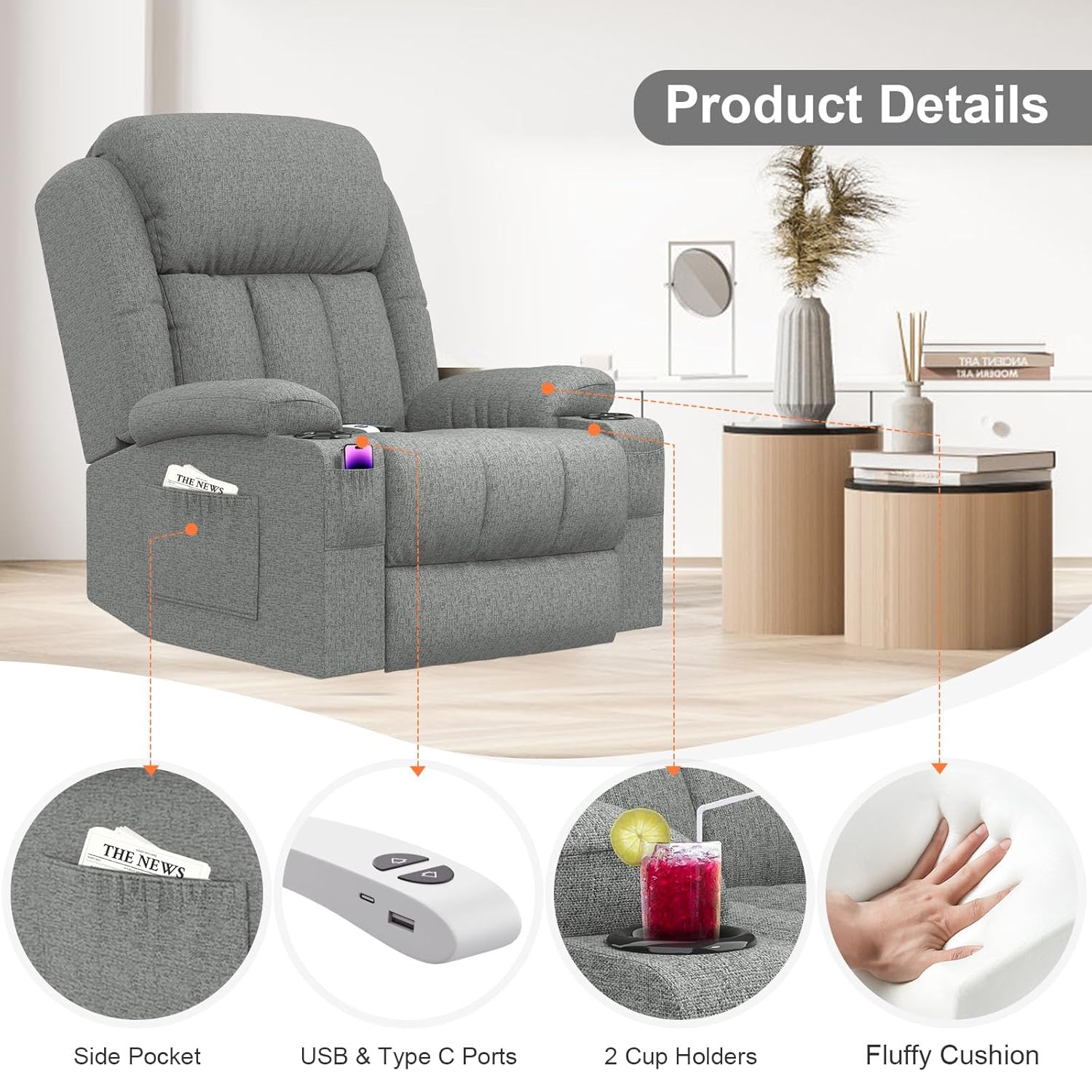 Die integrierten USB- und Type-C-Ladeanschlüsse befinden sich in Reichweite der Armlehne und ermöglichen es, Smartphones, E-Reader oder Kopfhörer während des Sitzens aufzuladen. Kein Kabelsalat, kein lästiges Suchen nach Steckdosen – alles ist im Sessel integriert.