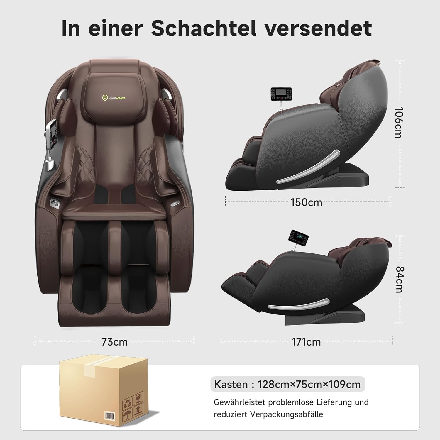 Der Massagestuhl ist aus hochwertigen Materialien gefertigt und überzeugt durch stabile Rahmenkonstruktion, langlebige Motoren und präzise Elektronik. Das braune Kunstleder mit seiner edlen Optik passt sich harmonisch in moderne Wohnräume ein, während die kompakten Abmessungen von 147 x 74 x 106 cm eine flexible Aufstellung ermöglichen.
