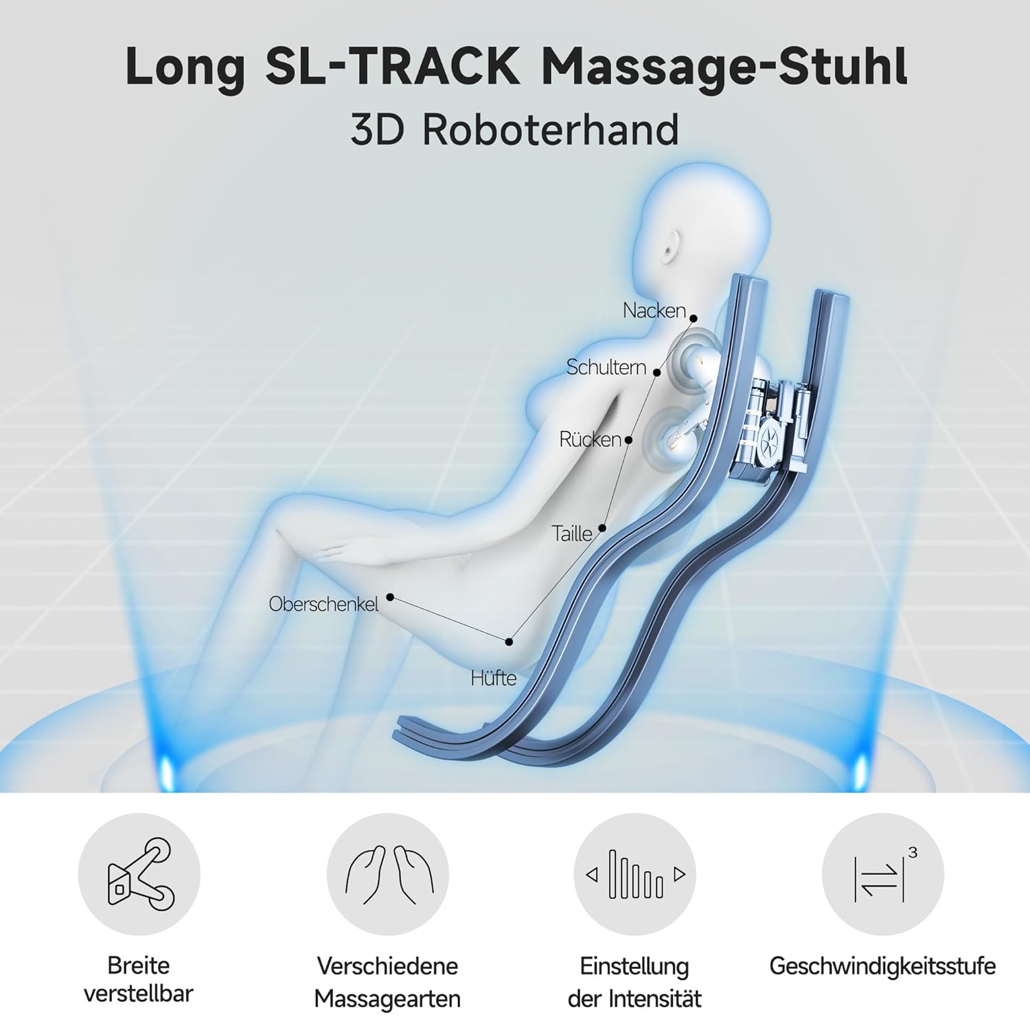 Die SL-Track-Technologie folgt der natürlichen Anatomie des menschlichen Körpers. Im Gegensatz zu herkömmlichen linearen Bahnen verläuft die SL-Track von der Halswirbelsäule bis hinunter zu den Oberschenkeln in einer geschwungenen Form, die exakt dem Verlauf der Wirbelsäule entspricht. Dadurch wird ein nahezu lückenloser Massagebereich geschaffen, der jeden relevanten Punkt entlang des Rückens erreicht. Die Massageköpfe bewegen sich fließend und geräuscharm entlang dieser Bahn und sorgen für eine durchgängige, gleichmäßige Stimulation.