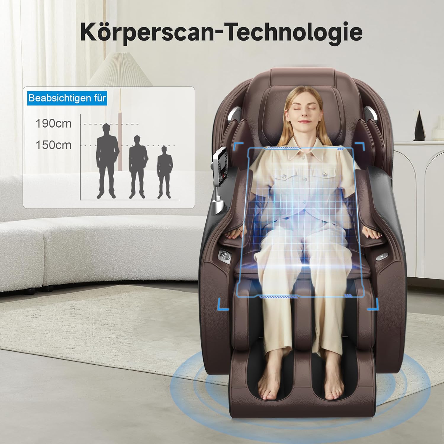 Der Body-Scan sorgt dafür, dass die Massageköpfe exakt die richtigen Punkte erreichen – unabhängig von Ihrer Körpergröße (bis 1,85 m) oder Ihrem Körperbau. So wird eine maximale Wirksamkeit erzielt, und jeder Nutzer erhält ein personalisiertes Erlebnis.