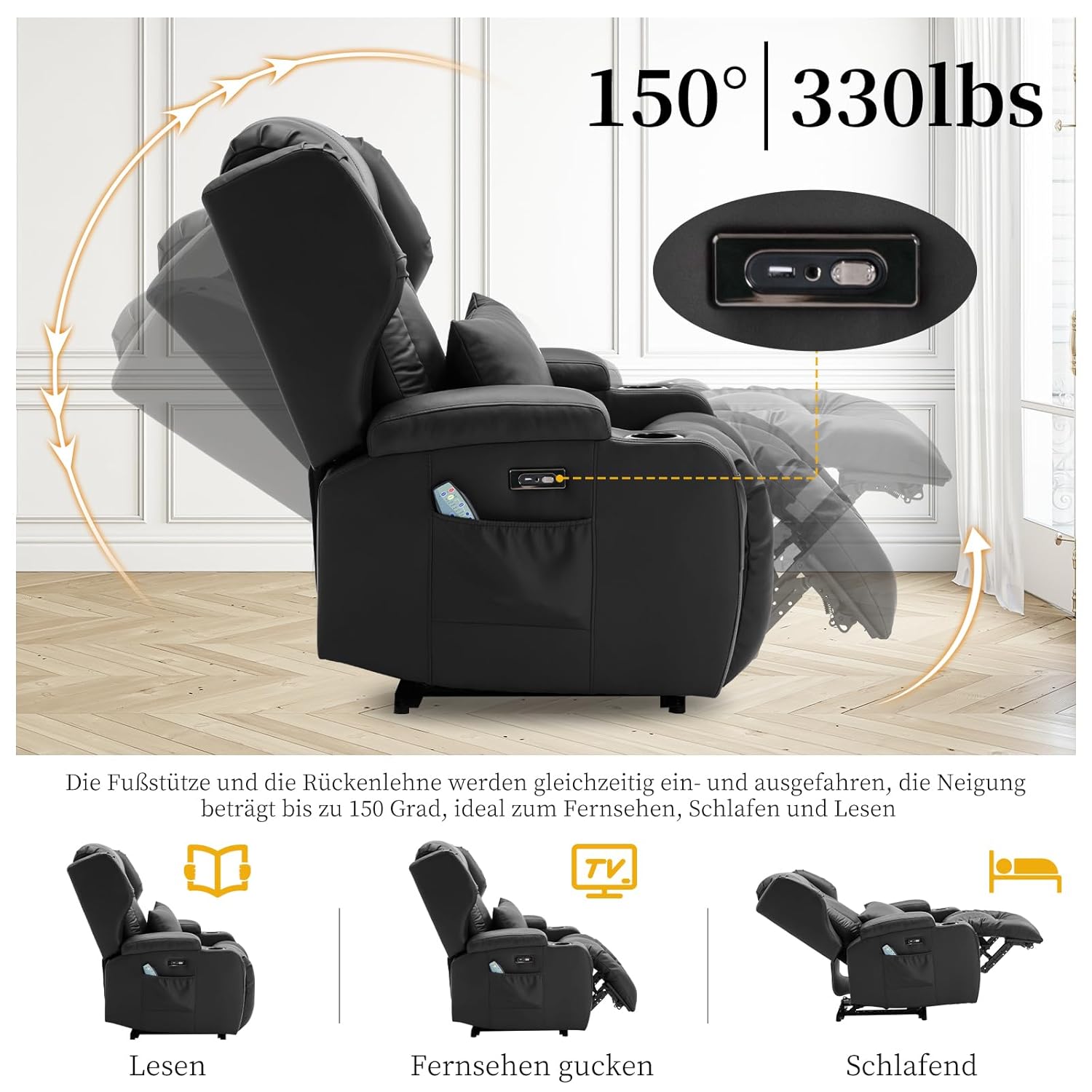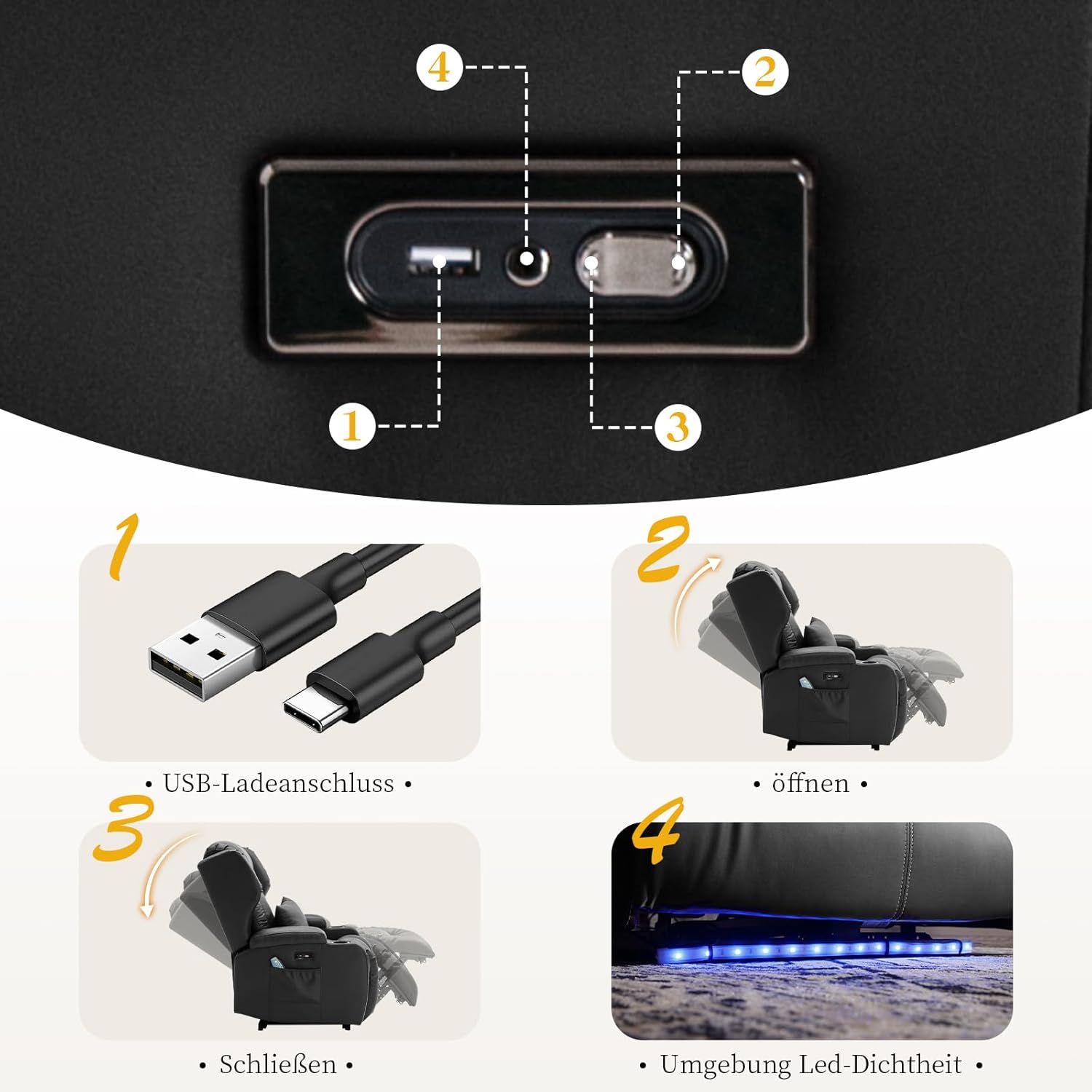 Ein USB-Anschluss am Sessel sorgt dafür, dass Ihr Smartphone oder Tablet immer geladen ist. Ob Sie Serien streamen, Musik hören oder einfach nur erreichbar bleiben möchten – Ihr Gerät ist immer einsatzbereit. Die moderne Ausstattung macht den Sessel zur perfekten Ergänzung eines smarten Zuhauses.