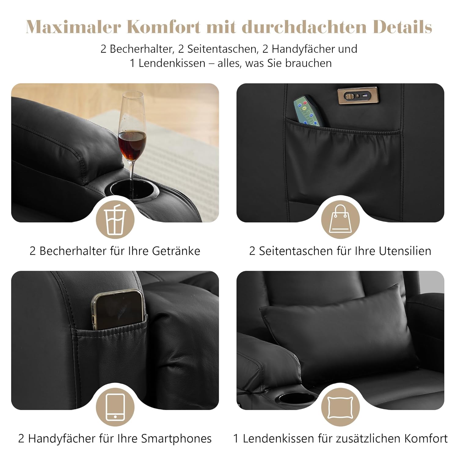 Ein weiteres Highlight sind die zwei Gurte, die beispielsweise Zeitungen, Decken oder Kissen fixieren lassen. Für moderne Nutzer besonders praktisch: Die integrierten USB- und Type-C-Anschlüsse ermöglichen das Aufladen von Smartphones, Tablets oder anderen Geräten direkt am Sessel. Während Sie entspannen, lädt Ihr Gerät bequem mit – ein echter Mehrwert für den alltäglichen Komfort. Bitte beachten Sie, dass der Type-C-Anschluss für geräteweise mit geringer Leistungsaufnahme wie iPhone oder iPad geeignet ist.