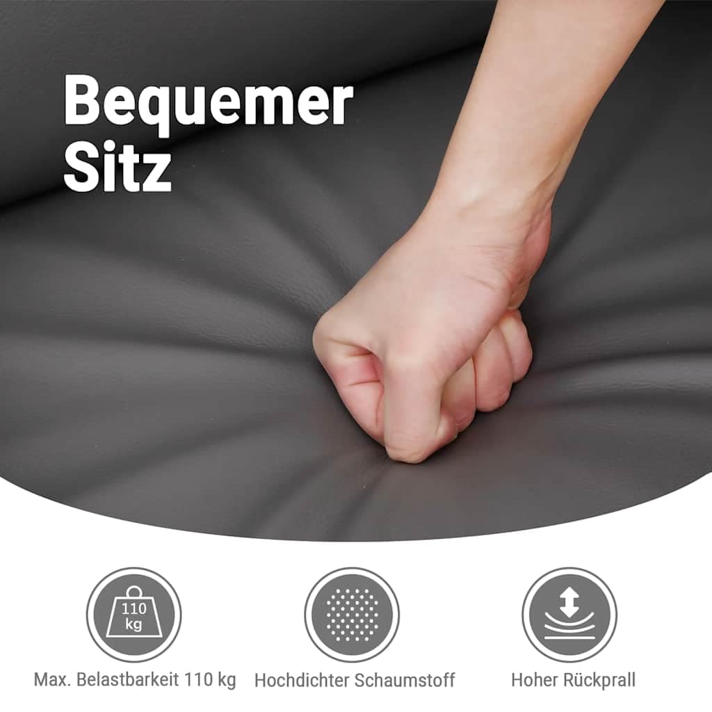 Die Sitz- und Liegefläche ist dick gepolstert und bietet optimale Druckverteilung. Das hochwertige Schaumstoffpolster passt sich sanft der Körperform an und verhindert Druckstellen, auch bei längerem Sitzen. Die Armlehnen sind besonders breit und ebenfalls weich gepolstert, sodass Arme und Schultern entspannen können. Das verwendete Kunstleder (Faux Leather) ist nicht nur optisch ein Highlight – es überzeugt auch durch seine Langlebigkeit und Pflegeleichtigkeit.