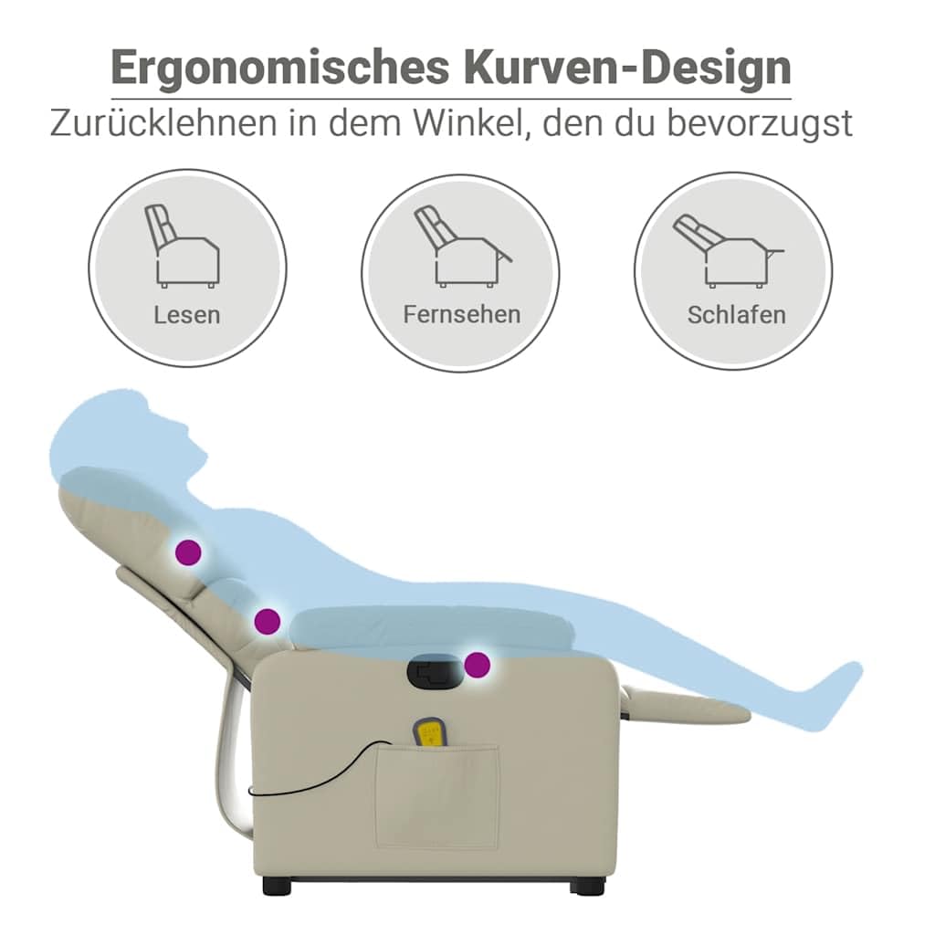 Ob nach der Arbeit, am Wochenende oder in den ruhigen Abendstunden – dieser TV-Sessel wird schnell zum Mittelpunkt Ihres Zuhauses. Mit seiner sanften Vibrationsmassage, der manuellen Lehnenverstellung und der elektrischen Aufstehhilfe bietet er ein Wohlfühl-Erlebnis der Extraklasse. Die hochwertige Kunstlederausstattung in cremeweiß sorgt für eine harmonische Optik, die sich elegant in jedes Wohnambiente einfügt – vom modernen Loft bis zum gemütlichen Wohnzimmer.
