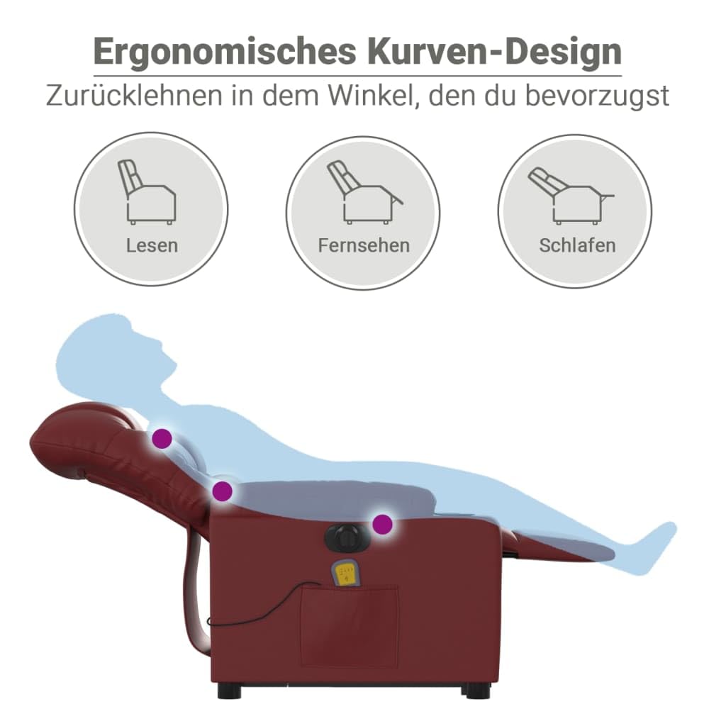 Die Oberfläche des vidaXL Massage Chairs besteht aus hochwertigem Kunstleder in einem edlen Weinrotton. Dieses Material überzeugt nicht nur durch seine ansprechende Optik, die dem natürlichen Glanz von Echtleder gleicht, sondern vor allem durch seine außergewöhnliche Langlebigkeit. Kunstleder ist extrem widerstandsfähig gegen Abnutzung, was besonders bei täglichem Gebrauch von Vorteil ist.
