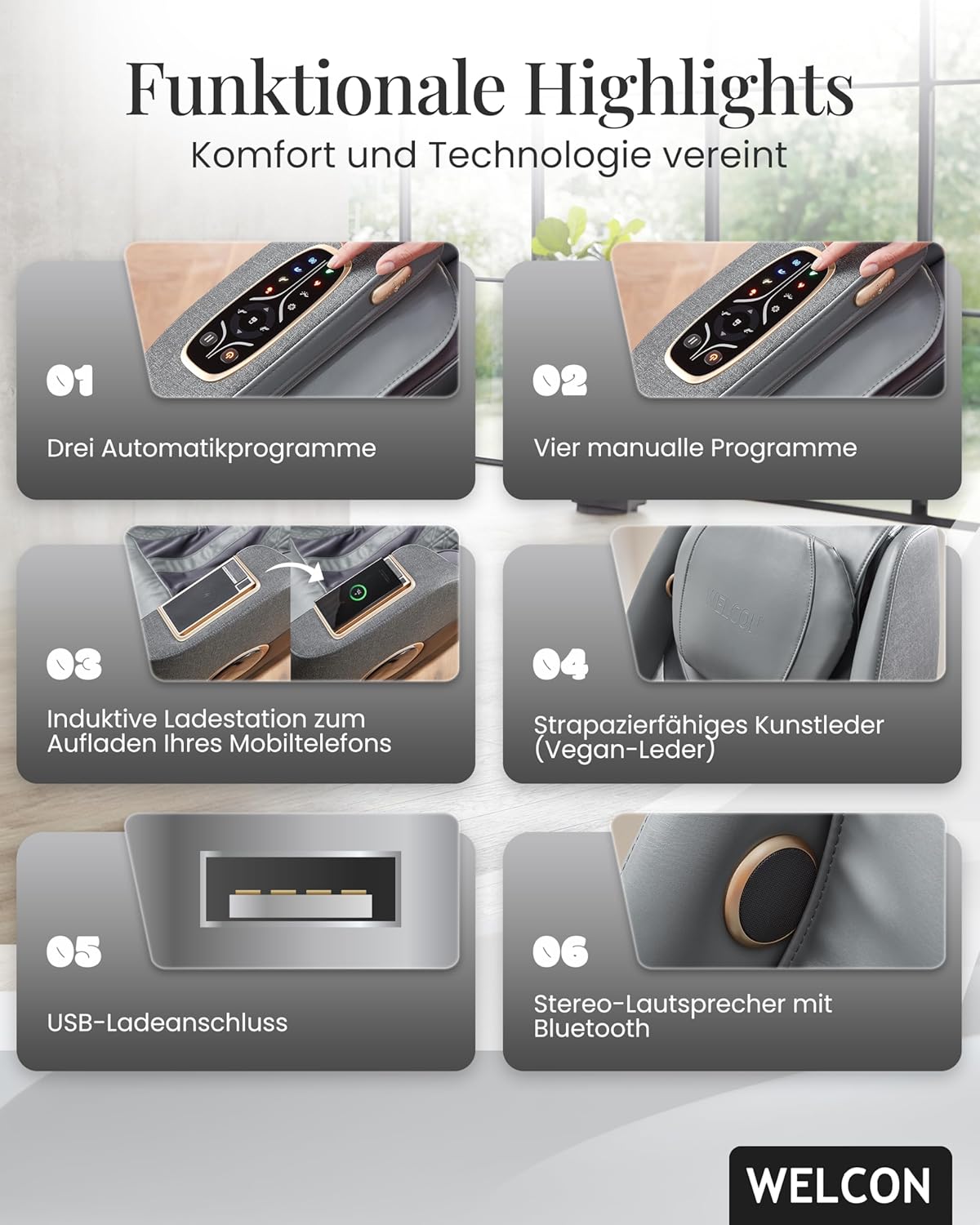 Der WELCON EASYRELAXX PLUS überzeugt nicht nur durch seine Massagefunktionen, sondern auch durch eine Reihe von Komfort- und Entertainment-Features, die das Erlebnis perfekt abrunden. Direkt in den Stuhl integriert ist eine Induktionsladestation für Ihr Smartphone – einfach das Gerät darauflegen und es lädt kabellos, während Sie massiert werden. Zusätzlich steht ein USB-Ladeanschluss zur Verfügung, falls Sie ein anderes Gerät aufladen möchten.