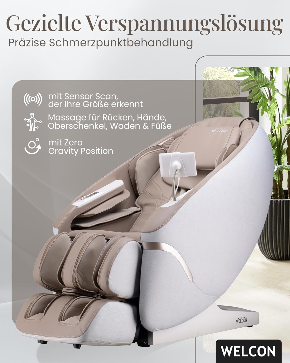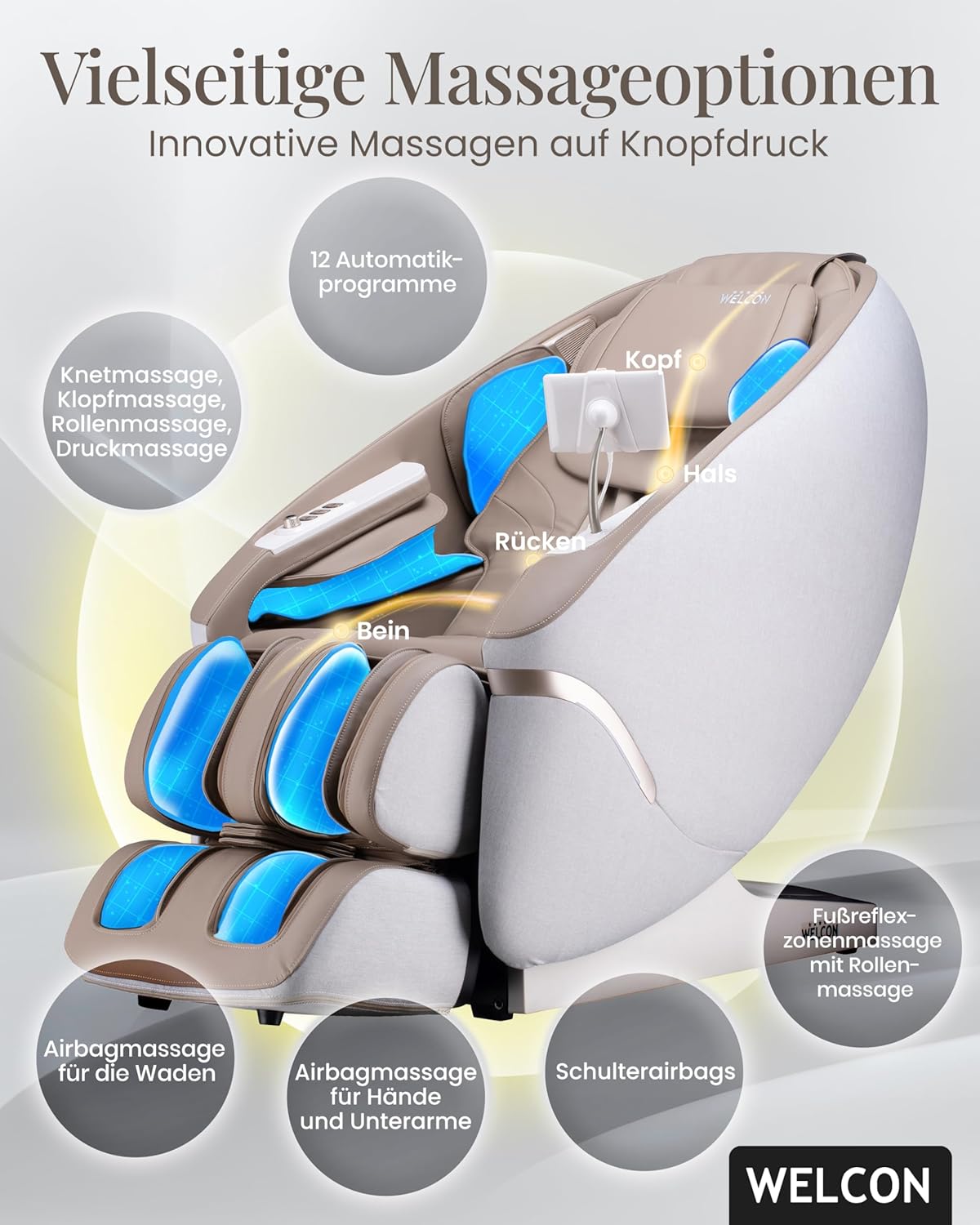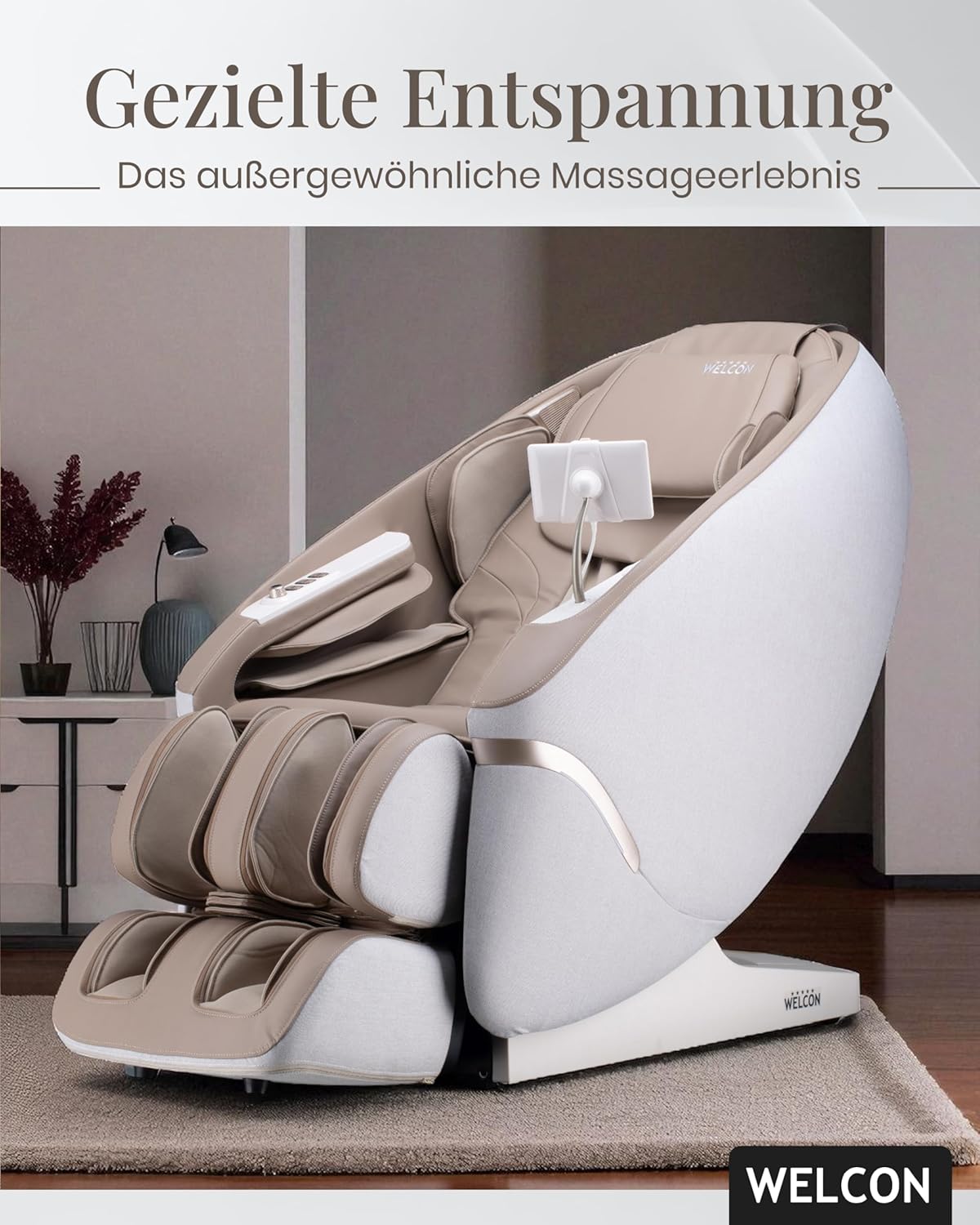 Genießen Sie das ultimative Wohlfühl-Erlebnis zu Hause mit dem WELCON Maxxcare Massage Chair in Beige/Brown (Modell 2026). Dieser Premium-Massagestuhl verbindet hochwertige Materialien, präzise Technik und ergonomisches Design zu einem wahrhaft luxuriösen Erlebnis. Entwickelt für Menschen, die Wert auf Gesundheit, Entspannung und Ästhetik legen, bietet der Maxxcare eine ganzheitliche Massage, die Körper und Geist auf sanfte Weise regeneriert. Ob nach einem langen Arbeitstag, zur Unterstützung der Regeneration nach sportlichen Aktivitäten oder einfach für die tägliche Entspannung – dieser Stuhl wird zum persönlichen Wellness-Experten in den eigenen vier Wänden.