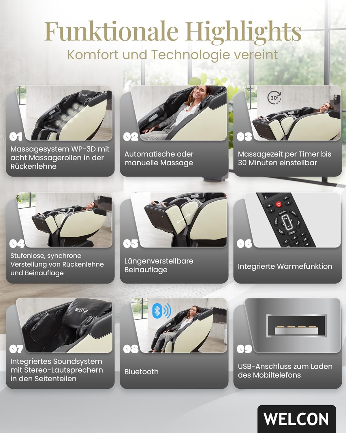 Sicherheit und Stabilität stehen bei WELCON im Mittelpunkt. Der Massagesessel ist für ein maximales Tragvermögen von 150 kg konzipiert und erfüllt höchste Qualitätsstandards. Die stabile Rahmenkonstruktion, die rutschfeste Sitzfläche und die sichere elektrische Steuerung garantieren ein sicheres Nutzungserlebnis für die ganze Familie.