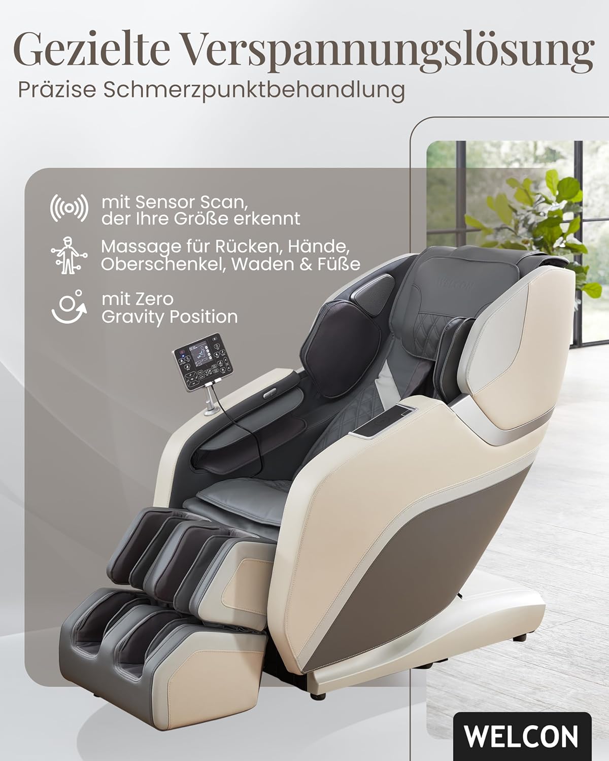 WELCON Prestige III Massagestuhl mit Sensor Scan und Körpergrößenerkennung für große Personen in Grau-Beige