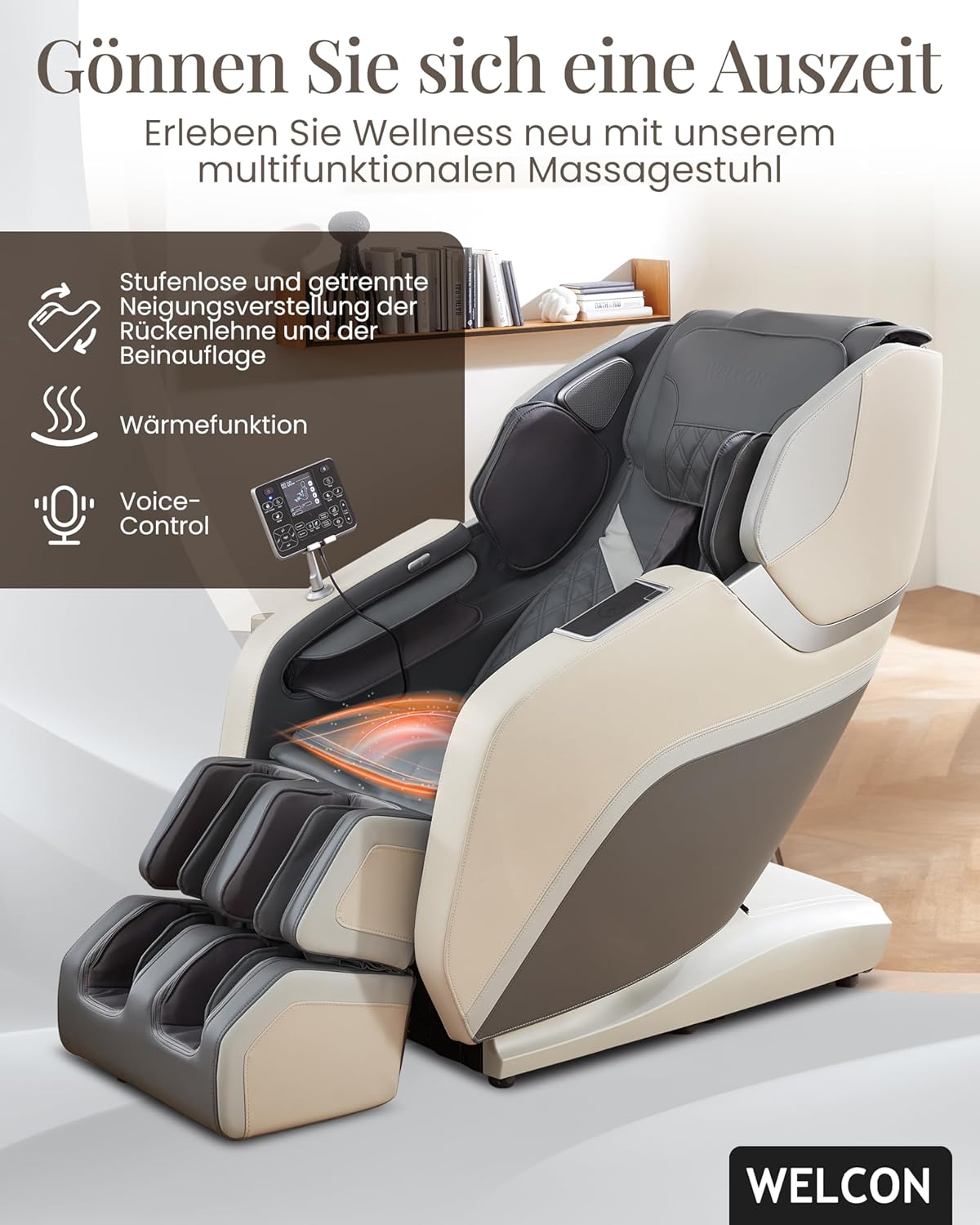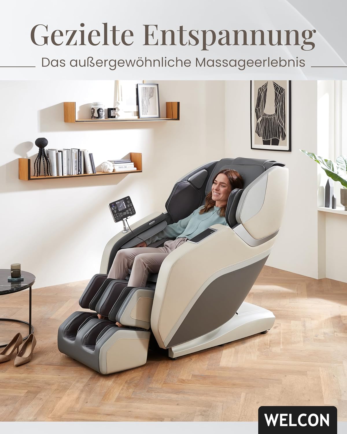 Der WELCON Prestige III Massage Chair in elegantem Grau-Beige ist mehr als nur ein Massagegerät – er ist ein persönlicher Wellness-Begleiter, der modernste Massage-Technologie mit durchdachtem Design und höchstem Komfort vereint. Entwickelt von WELCON, einem deutschen Unternehmen mit über 25 Jahren Erfahrung in der Herstellung hochwertiger Wellness-Produkte, steht dieser Massagesessel für erstklassige Verarbeitung, langlebige Materialien und eine Massage-Erfahrung, die Maßstäbe setzt. Ob nach einem langen Arbeitstag, zum Ausgleich sportlicher Betätigung oder einfach zum bewussten Innehalten – der Prestige III bietet eine ganzheitliche Entspannung, die tief in die Muskulatur wirkt und den Geist zur Ruhe kommen lässt.