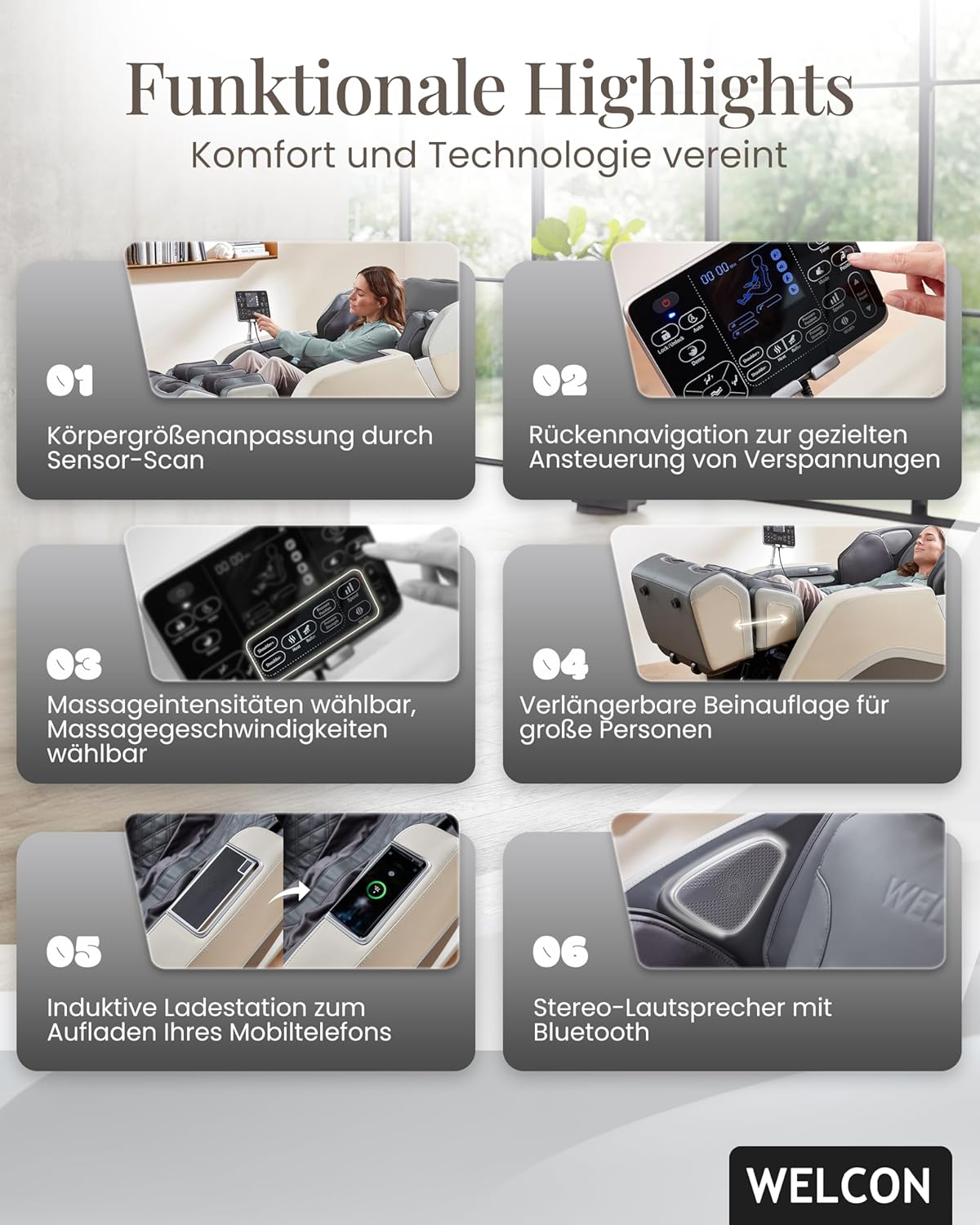 Entspannung, die perfekt zu Ihnen passt – der WELCON Prestige III Massagesessel mit intelligentem Sensor-Scan und 4D-Technik verwöhnt Ihren gesamten Körper von Kopf bis Fuß. Genießen Sie professionelle Massageprogramme, die sich automatisch an Ihre Körpergröße anpassen, oder wählen Sie gezielt Ihre Lieblingszonen – mit Wärme, Airbag-Massage und Zero-Gravity-Feeling für maximale Entspannung. Deutsche Qualität, TÜV-geprüft, mit…