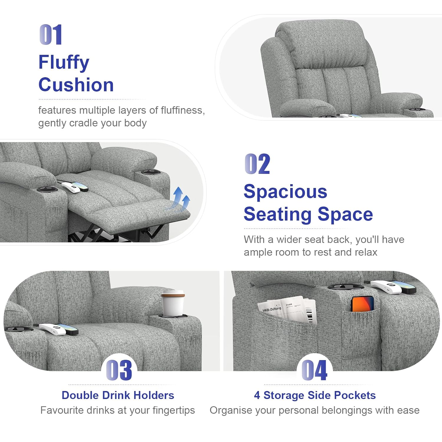Zwei integrierte Getränkehalter sorgen dafür, dass Tee, Wasser oder Saft sicher verstaut sind – ideal beim Fernsehen, Lesen oder Telefonieren. Die Halter sind rutschfest und passen sowohl für Standard-Becher als auch für größere Trinkflaschen. Zusätzlich verfügt die Fernbedienung über USB- und Type-C-Anschlüsse, sodass Smartphones, Tablets oder andere mobile Geräte jederzeit geladen werden können. Nie wieder der suchende Griff zum Ladekabel – der YONISEE Sessel ist Ihre persönliche Ladestation im Wohnzimmer.
